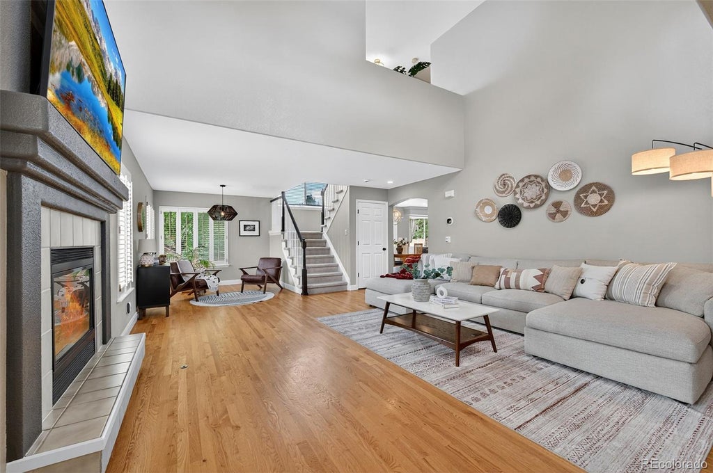 This stunning 4-bedroom, 3-bath residence combines timeless elegance with modern luxury, featuring extensive hardwood floors on the main level, soaring vaulted ceilings in the family room, and abundant natural light throughout. The gourmet kitchen is designed for both beauty and function with quartz countertops, a center island, premium Samsung stainless steel appliances (2023), and a converted gas stove for culinary excellence. The serene primary suite offers a remodeled spa-like bath and a generous walk-in closet, while the finished basement provides a refined retreat with a recreation room and a private office with French doors. Recent upgrades include new upstairs carpeting (2024), remodeled powder bath in 2023, a washer and dryer (2024), EV charger hookup (2023), and fresh exterior paint (2025). Outdoors, a level backyard with a charming patio and pergola offers the perfect setting for sophisticated entertainment, all under the enduring quality of a tile roof.  This home also grants access to four state-of-the-art recreation centers, vibrant community events, farmers markets, live concerts, and over 70 miles of scenic trails.