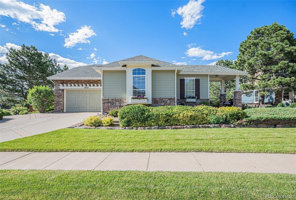 A great house just got greater!! August 2025 Class 4 impact resistant Presidencial shake composite new roof installation. Roof warranty transferrable to new owner. Highly desirable Sunrise Ridge neighborhood, priced to sell, this immaculately maintained ranch style home is ready for new owners. Four bedrooms and three bathrooms it is move-in ready.Your first impression when you enter is the 10-foot ceilings and open space of the living room and dining room. The living room has a gas fireplace. Hardwood floors of wide plank medium oak throughout. Quality built-in shelving in the office, primary bedroom and elsewhere. Beautiful crown ceiling molding, stain glass windows and door transoms. Gourmet kitchen with enlarged custom island, lighting and glass door display cabinets, gas stove, designer tile backsplash, a walk-in pantry and a separate breakfast nook. Kitchen counters are Corian with the island top of granite. The laundry room includes washer and dryer, a utility sink, cabinets and counter space. The large primary bedroom boasts floor to ceiling built-in shelving and a cushioned window seat. The primary bathroom has a spa-like tub, large shower, dual sinks and cabinetry. Two large walk-in closets are also in the primary bathroom. The back patio with mountain views is surrounded by flower gardens. On the West side there is an outdoor eating area. With no neighbor positioned on the West side you’ll have privacy and a scenic vista. Moving downstairs there is a finished basement with 8-foot ceilings, plush carpeting, and entertainment center is included. Two large bedrooms with egress windows and a 3/4 bath, along with an exercise room, are on this level. Also, on this level is a very large storage room with shelving. The 3-garage spaces have epoxy flecked floors and built-in storage cabinetry. This neighborhood is conveniently located near shopping, restaurants and many businesses. Easy access to trails and parks. The community pool is across the street.