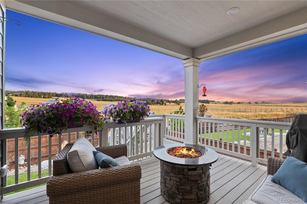 Covered rear porch with stunning views of Pikes Peak, pines, and plains.