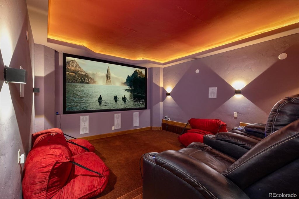 Transform your evenings with a true cinematic escape right at home. This custom-designed private theater features tiered leather recliners, ambient LED ceiling lighting, acoustic wall treatments, and a full surround sound speaker system for a premium movie-watching experience. Whether you're streaming the latest release or hosting a game-day gathering, this Breckenridge home theater offers a cozy, high-end entertainment space ideal for second-home relaxation or short-term rental appeal. A rare luxury in mountain properties, it adds value and lifestyle all in one. Life is good here.