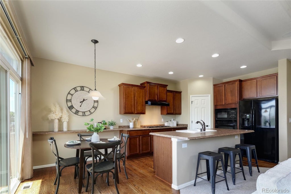 OPEN HOUSE on Saturday!... come and see for yourself! Enjoy the comfort and convenience of single-level living in this spacious ranch-style home with a full daylight basement, perfectly situated near I-25. From the moment you step inside, you'll appreciate the thoughtful details: rich hardwood floors, elegant rounded corners, tray ceilings, a handy service pantry, and brand-new carpet in the main living areas.The oversized primary suite offers a relaxing retreat with a luxurious five-piece ensuite bath featuring dual vanities, a soaking tub, and a separate shower. The open-concept kitchen and living room are warm and inviting-ideal for everyday living or entertaining guests. Cozy up by the fireplace or step out onto the back deck to unwind while overlooking a peaceful community courtyard. Enjoy low-maintenance outdoor living with a front and back yard sprinkler system keeping your fenced yard green and pet-ready. Mature landscaping adds charm and curb appeal without the upkeep. Additional highlights include main level laundry and a full unfinished basement offering endless possibilities for expansion. Recent upgrades, including a new roof (2023), recently serviced furnace & A/C, and an active radon mitigation system with sump pit and pump. Located in a friendly, active neighborhood with regular events like food trucks, community picnics, clubhouse and pool, this home is also convenient to I-25, the new elementary school, and a popular local farmers market. Don't miss your chance to see this delightful home-schedule your tour today!