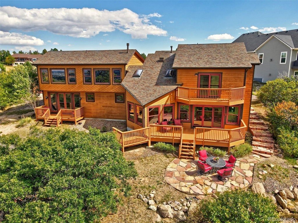 Views, Views, Views! This custom acreage home sits high up on a ridge with spectacular views of Castle Rock and the Rockies. It is the essence of tranquil mountain living yet just minutes from old town Castle Rock and I-25. Situated on a sprawling 1.2-acre lot in a coveted neighborhood with no HOA fees, this residence offers exceptional privacy and serenity on a quiet cul-de-sac street. · Classic Colorado Style: Contemporary architecture blends seamlessly with the natural beauty of the surrounding landscape. Warm accents include a soaring stone fireplace, hardwood floors, granite countertops, and custom wood cabinetry. · Breathtaking Views: All main rooms showcase iconic vistas of Castle Rock and the Colorado mountains, with three private decks perfect for savoring vibrant sunsets and tranquil evenings. · Spacious & Modern Interior: Boasting two generous master suites and an updated gourmet kitchen with high-end finishes, this home is designed for comfort and enjoyment. All living spaces are above ground, offering bright, airy rooms. · Versatile In-Law Suite: A fully equipped suite provides ideal accommodations for extended family, guests or potential rental income. · Generous Parking & Storage: A three-car attached garage plus a detached two-car garage, offering five-car capacity, caters to car enthusiasts and hobbyists alike. · Outdoor Oasis: Unique, natural private sitting areas among the natural rock ledges and towering pine trees create serene spaces for relaxation and connection with nature. Concrete hot tub pad with hookups (and views).
