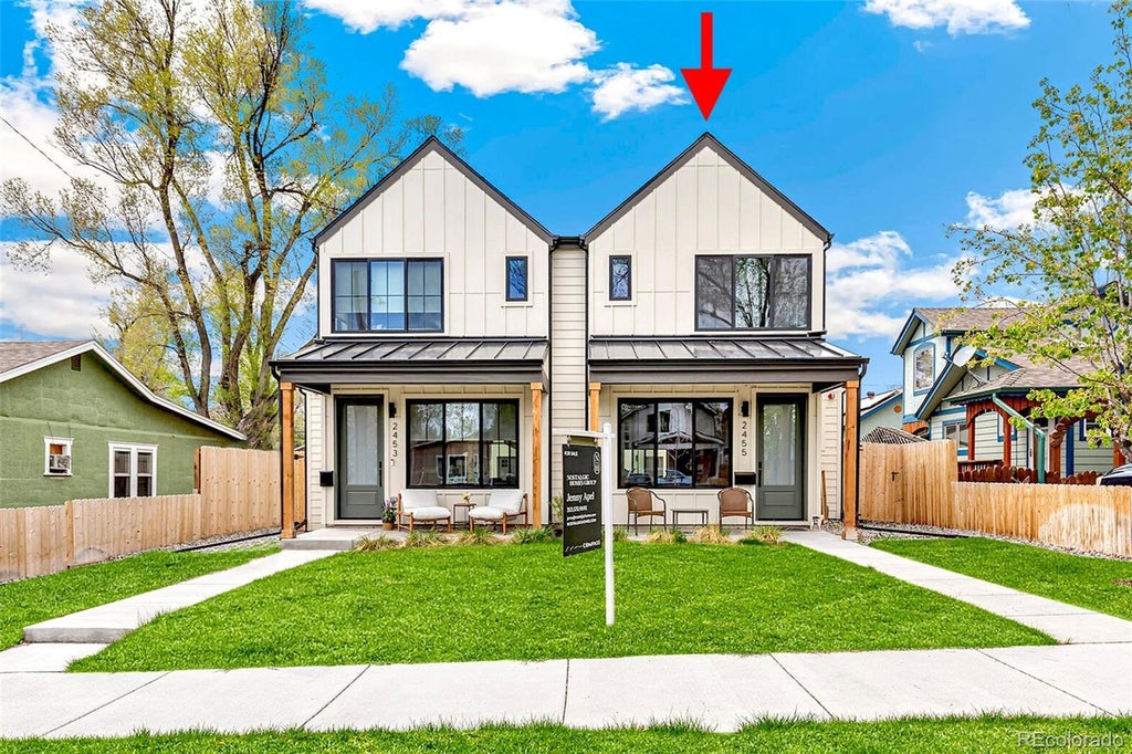 BEST VALUE FOR NEAR NEW TOWNHOME! New Price on Sophisticated & Modern Edgewater Half-Duplex Offering Lux Living! This is a near new townhome, lightly lived in - only steps to everything in popular Edgewater - Drinks, dining, coffee, workouts, parks & much more! Step in from the inviting covered front porch and discover a light-filled, thoughtfully designed interior with chic, contemporary finishes. Rich hardwood floors flow through the dining area, kitchen, and living room, creating a warm, cohesive feel. The chef’s kitchen elegantly blends form and function with a generous island and bar seating, stylish tile backsplash, dedicated pantry, and gas range with a convenient pot-filler. The living room centers around a sleek tile fireplace and opens onto a west-facing back patio, perfect for savoring sunset dinners alfresco. A well-placed powder room completes the main floor. Ascend to the elegant primary suite, highlighted by a tray ceiling with woodgrain detail, oversized windows, and an enviable walk-in closet. The spa-inspired ensuite bath features dual vanities, a private water closet, and a glass-enclosed shower. An additional upstairs suite offers vaulted ceilings, plenty of space for a king-sized bed, ample closet storage, and a private ¾ bath. The hallway laundry closet adds everyday convenience. Down to the finished basement, where your living space is expanded with a large family room, wet bar with beverage fridge, a full bath, and a spacious bedroom complete with an egress window and a walk-in closet. Outside, enjoy a sunny patio ideal for year round enjoyment, space to play with your pup, and urban garden space for fresh herbs and flowers. A detached oversized one-car garage provides secure parking and extra storage, plus an adjacent off-street parking spot. Moments from Edgewater Public Market, Sloan’s Lake, local cafés, and breweries—this home delivers the perfect mix of style, comfort, and location—Come see it for yourself!