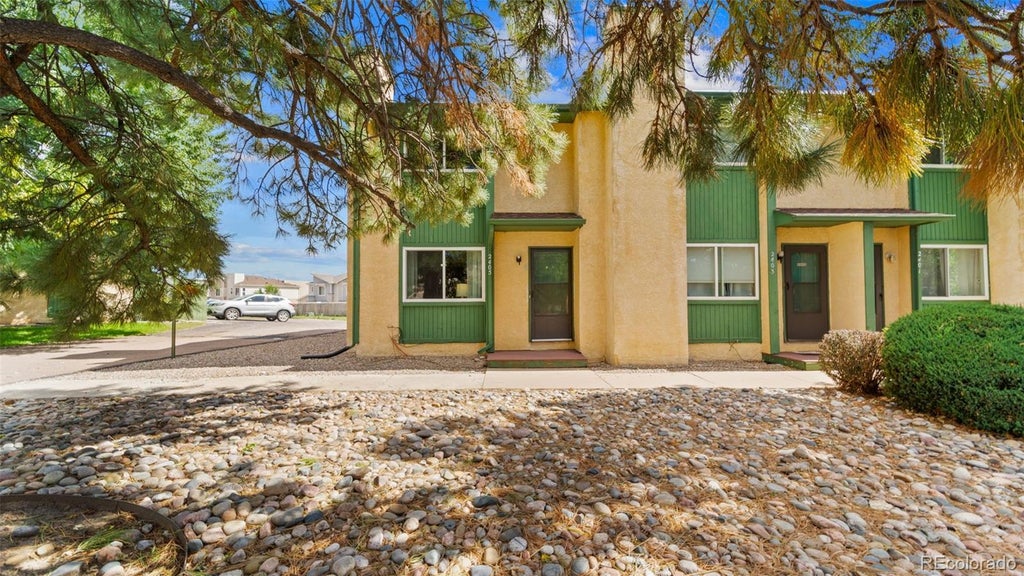 Well-maintained end-unit townhome with convenient access to Powers Corridor, Constitution Ave, and nearby shopping, dining, and parks. This 2-bedroom, 2-bath home offers an open main-level layout with a spacious living area, wood-burning fireplace, and adjoining dining space. The kitchen includes updated countertops, appliances, and a laundry nook. Flooring features luxury vinyl plank on the main level and newer carpet upstairs. Upstairs, you’ll find two bedrooms and a full bath. Recent updates include fresh interior paint, windows, and modern finishes throughout. Exterior storage closet and two designated parking spaces are located directly behind the unit. HOA provides snow removal and exterior maintenance for low-maintenance living. Located minutes from schools, grocery, and the new Constitution/Marksheffel shopping area, with easy access to Highway 24 and Peterson SFB.