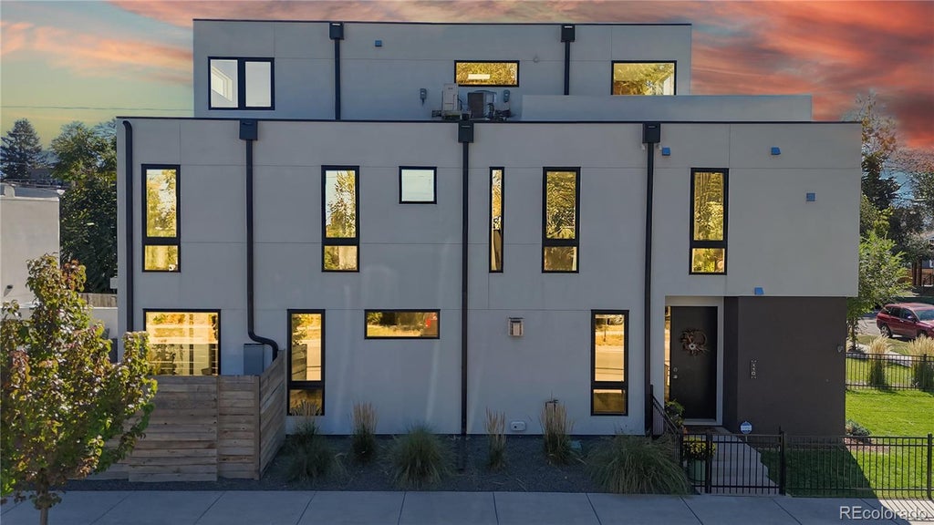 The perfect, like-new contemporary townhome with striking mountain views and sunsets from the private rooftop patio and retreat room with a wet bar and a secluded bedroom with murphy bed ideal for guests or use as office on the private 3rd floor! The open concept main floor plan includes a gourmet kitchen open to dining and living area with quartz composite counters, 5 burner gas stove/convection oven, pantry with pullout drawers and an over-sized island with breakfast bar and waterfall edge. Full height sliding glass door opens to wonderfully spacious private and secluded outdoor patio and backyard with built-in gas fireplace to keep you cozy on those cool nights. Patio and backyard also includes a hot tub, raised garden bed plus a playhouse and sand box for the kids and a storage shed. Second floor spacious primary suite with sitting area is a retreat from the outside world with spacious 5-piece bath complete with soaking tub and oversized frameless glass shower! There are two more bedrooms with full height glass windows overlooking front yard and served by a full bath and a convenient laundry closet in the hall. This home is conveniently located 1/2 block from Rosedale and City of Kunming parks and 2 1/2 blocks from Harvard Gulch Park with soccer fields, volleyball, neighborhood pool, 9-hole golf course, playground and walking/running paths and it is also within just blocks of multiple restaurants and shops on South Broadway. First floor also includes a sunny office/studio in the front with full height glass that overlooks the fenced front yard. Recently painted and custom 2-way blinds (2022), carpeted (2024). Built-in wiring for high-speed internet and audio/visual. Sprinkler system in raised garden bed, front and side.