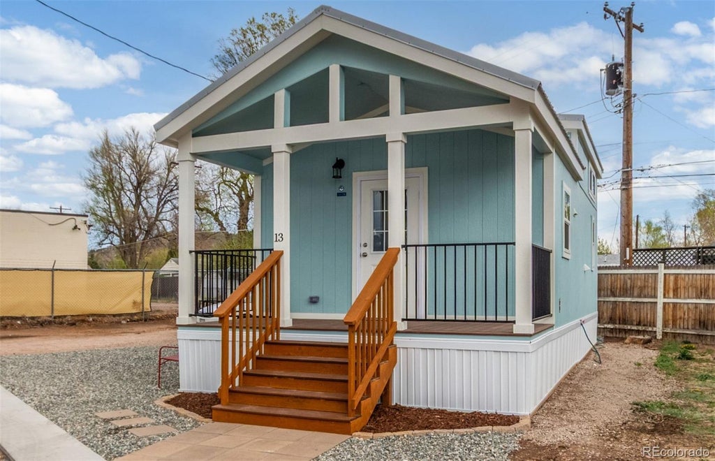 Step into stylish, simplified living with this brand new tiny home located in the heart of Colorado Springs Estates! Nestled on a clean corner lot, this beautifully designed home offers incredible views of Pikes Peak right from your front porch. The bright and open interior is thoughtfully finished with luxury vinyl flooring, vaulted ceilings, and recessed lighting that enhances the modern aesthetic. The sleek kitchen features white shaker cabinets, a chic subway tile backsplash, and modern black appliances. Enjoy the smart use of space with a cozy loft area that offers flexible room for lounging, storage or an additional bed area. The bathroom is equally impressive, showcasing marble-look countertops, white cabinetry, and a full-sized step in shower with built in seats and sliding glass doors. With a dedicated bedroom, stylish built-ins, and laundry hook-ups, this home proves you don’t have to sacrifice comfort for convenience. Step outside to your easy-care landscaping, private fenced yard and designated OFF street parking. Located in a welcoming community near parks, dining, and downtown Colorado Springs — this is tiny living at its absolute finest! This community is located just a short distance to Garden of the Gods, Manitou Springs and Cave of the Winds Mountain Park and in walking distance to Flanagan Park.