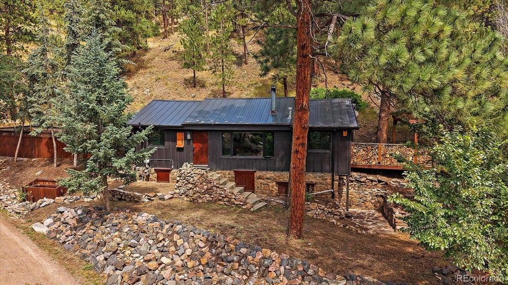 Ever dreamed of living in the mountains—without breaking the bank? If so, this charming mountain retreat is calling your name. Nestled among towering pines in a peaceful natural setting, this upgraded home offers the perfect blend of rustic charm and modern comforts. As you arrive, you'll appreciate the elevated driveway and desirable southern exposure, along with the durable metal roof, Marvin windows, spacious outdoor deck, and fenced backyard area. Step into the tiled foyer, which opens to a light-filled living room featuring large windows that frame serene views of the forested surroundings. Hardwood flooring, crown molding, beamed ceilings, and built-in features enhance both the character and functionality of the space. The open-concept layout seamlessly connects the living, dining, and kitchen areas—ideal for gatherings or simply enjoying the mountain lifestyle. The kitchen is well-appointed with stainless steel appliances, a double sink, pantry, and breakfast bar. The primary bedroom offers hardwood floors, crown molding, a walk-in closet, and sliding doors leading to the private deck—a peaceful spot for morning coffee or afternoon refreshments. A full bathroom with a solid-surface countertop and tile backsplash serves the home, while a versatile secondary bedroom (currently used as an office) adds flexibility to the floor plan. The laundry area is located in a cheerful, natural wood-paneled room with convenient access to the backyard.