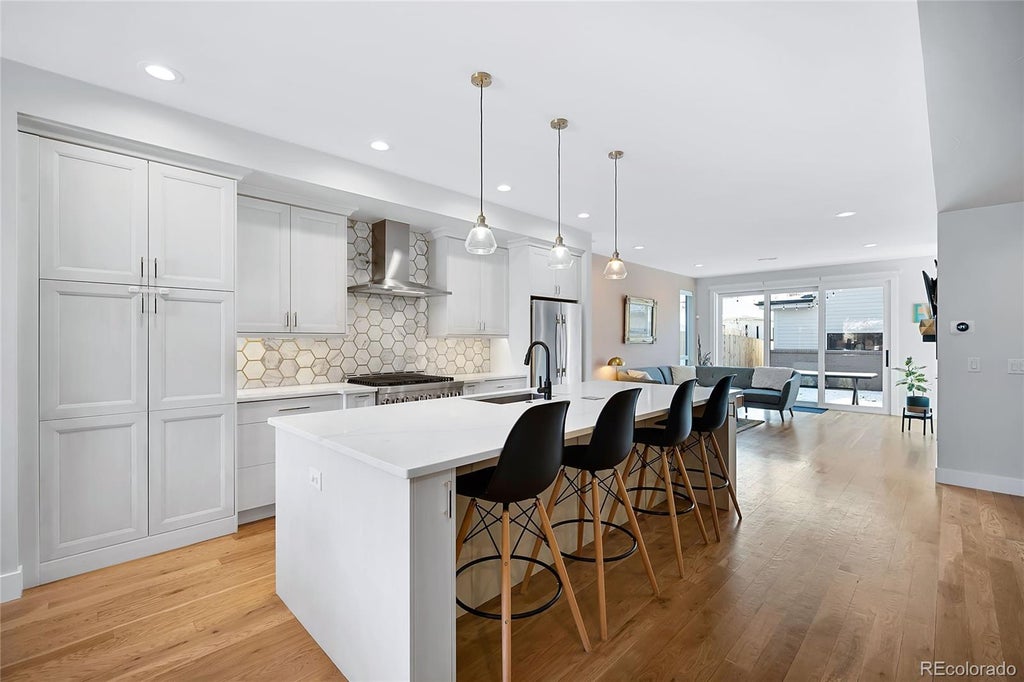 Modern half-duplex just one block from City Park, featuring a finished basement, fenced back yard, and insulated 2-car garage with custom rock climbing wall and level 2 EV charger. The main floor boasts a modern open layout with quartz counters and premium JennAir appliances in the kitchen, a living room with gas fireplace and triple slider patio door, a built in desk area, and a powder room. The primary suite, primary bathroom, and an additional full bathroom, bedroom, and guest room with covered balcony, are on the 2nd level. The finished basement has a bonus living room with wet bar, a 4th bedroom, and a full bathroom.