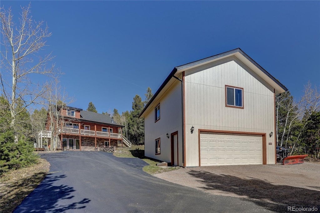 Beautiful log home with panoramic views! Pride of ownership with thoughtful updates and meticulous maintenance. A sunny, South facing, paved driveway with beautiful aspen trees welcome you to this immaculate 4 bedroom, 3 bathroom home, on 2+ acres with picturesque views of Staunton State Park, plus more! There is an amazing, finished living space above the garage that could be ideal for an office, workshop, yoga or dance studio, etc.! The space above the garage includes a pellet stove and a closet. This charming mountain home’s high end features include a Coleman Generator Powermate 6250 Watts, a 1-year old roof, and Champion Windows with warranty. The bright living room features a vaulted ceiling and one of the home’s two additional pellet stoves, creating a cozy space. The inviting dining area adjacent to the kitchen is perfect for easy living and entertaining. The kitchen also includes its own balcony. Enjoy the magnificent mountain views from the deck accessible from the living area. The main floor also includes a bedroom, and an updated ¾ bathroom. The walk-out lower level features the bright family area with a pellet stove, and access to the large patio. The lower level also includes a bedroom with beautiful built-in shelving and a walk-in closet, an updated ¾ bathroom, and the utility/laundry area. The upper-level features two additional bedrooms, including the primary room, and a full bath. Immerse yourself in the Colorado lifestyle on your large patio, with a stunning atmosphere and abundant wildlife. Close to 285 for convenience, 1 minute to the local firehouse, and the school bus picks up at the end of the driveway. Welcome to your Colorado dream home!