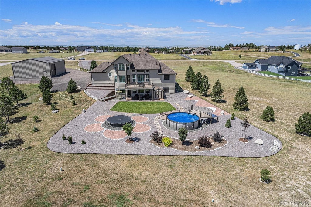 Welcome to your dream home in the highly sought-after Brittanie Ridge Estates in Elizabeth, CO. From the moment you arrive on the paved driveway, you’ll be greeted by meticulous professional landscaping and mature trees framing the property. Featuring 4 bedrooms, 3.5 bathrooms, a spacious walkout basement, an oversized 3-car garage, and a massive detached shop, this home offers the perfect blend of space, comfort, and freedom to live the lifestyle you’ve always envisioned. Step through the custom speakeasy front door and discover a home filled with exceptional features. The main living area boasts abundant natural light, granite countertops, 42” custom cabinetry, slate stainless-steel appliances, an eat-in kitchen and breakfast bar, plus a formal dining area. Impressive vaulted ceilings, stone gas fireplace, wrought iron railings, plantation shutters, and a walk-out Trex balcony elevate the space. The main-level primary suite offers a 5-piece bath, and 11x8 walk-in closet. Upstairs, you’ll find two generous bedrooms, full bath, and spacious bonus room with a walk-in closet ideal for a media/family/fifth bedroom. The finished walkout basement is an entertainer’s dream, with a rustic wet bar, theater room, guest bedroom, ¾ bath, and easy outdoor access to the above-ground saltwater pool with custom deck and swim up bar—perfect for summer relaxation. Car lovers will appreciate the fully finished, heated, oversized 3-car garage with hot/cold water spigot. Outdoor enthusiasts will be drawn to the 2252 sqft shop with 2 14’ RV doors. Residents enjoy 84 acres of neighborhood open space for riding ATVs/recreation. For horse lovers, the community is equestrian-friendly. Bonus - the home is fitted with Jellyfish Lighting! New roof, exterior paint and Anderson windows in the last year. HVAC and water heater are only 3 years old! Just a short 15 minutes from Elizabeth, 25 minutes from Parker. This is more than a home—it’s a lifestyle.
