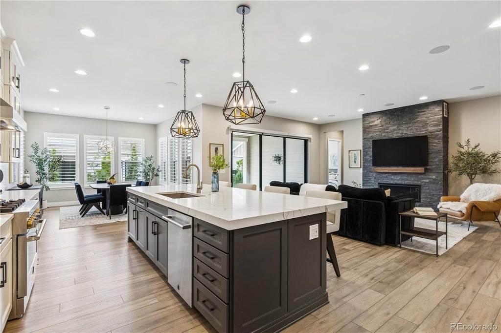 This exceptional property in the highly desirable Solstice community is truly better than new—featuring over $450,000 in upgrades, including $50,000 in professional landscaping, fencing, lighting and two-tier upscale tile outdoor entertainment areas. Recent additions include an extended basement finish with golf simulator room, bonus room and theater; new custom gym doors, garage epoxy flooring and whole house humidifier. The main level showcases luxury vinyl plank flooring, soft designer paint colors, plantation shutters, upgraded light fixtures, and integrated smart home features. The expansive open floor plan includes a gourmet kitchen outfitted with a Bosch refrigerator and Jenn-aire microwave, dishwasher, gas range, double ovens, quartz countertops, under-cabinet lighting, a large center island with seating, and a spacious walk-in pantry. The kitchen flows seamlessly into a bright and inviting Great Room centered around a dramatic 42” gas fireplace with floor-to-ceiling stonework and built-in in-ceiling speakers. Large 3-panel sliding glass doors open to a beautifully designed backyard, where motorized Hunter Douglas Smart roller shades allow for comfortable indoor-outdoor living. An elegant primary suite offers a spa-style bathroom with high-end finishes, custom tilework, and a professionally designed walk-in closet. Two additional en-suite bedrooms provide comfort for family or guests, while a private home office offers the perfect space for remote work. A finished basement takes this home to the next level with a spacious rec room, wet bar complete with a beverage cooler and dishwasher, a glass-enclosed workout room, golf simulator room, craft room, guest suite and home theater with components and theater seating included. Solstice residents enjoy access to premium amenities, including the High Line House clubhouse, resort-style pool and direct access to the High Line Canal, Chatfield Lake and State Park, trails, parks and scenic open spaces.