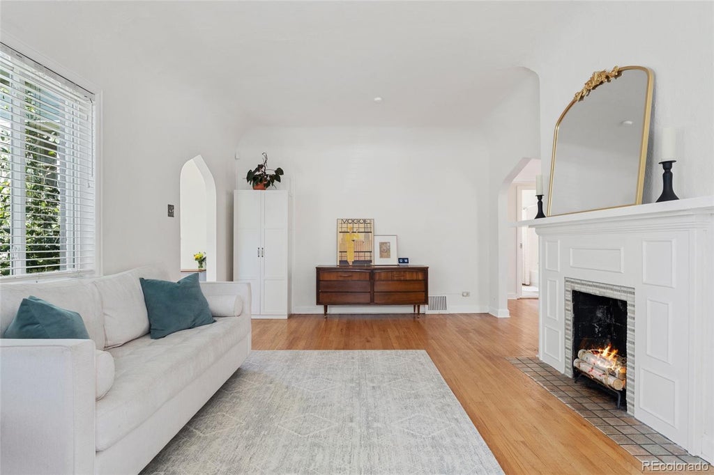 Welcome to this cozy brick ranch home on a spacious corner lot in the highly sought-after Mayfair community. Brand new furnace and kitchen countertops in 2025 and new windows in 2024! Full of charm and character, this 1930s gem has been beautifully updated while retaining its original warmth, offering incredible natural light throughout. Arched openings, cove ceilings, and oak hardwood floors add timeless elegance, while the bright and cheerful chef’s kitchen impresses with stylish finishes, shaker cabinets, stainless appliances with gas range, quartz countertops, subway tile backsplash, and two garden windows above classic glass blocks. A separate dining room creates the perfect space for gatherings. The main level offers two well-sized bedrooms, while the finished basement provides a large family room complete with wet bar and fireplace, two additional bedrooms, a full bath, generous closet space, and a laundry room. The fully fenced backyard is both peaceful and private, with plenty of room to entertain or simply unwind. Additional recent updates include new basement floors (2022), a remodeled basement bath (2024), new water heater (2025). All of this within walking distance to shops, trendy restaurants, parks, and just blocks from City Park and the Denver Zoo.