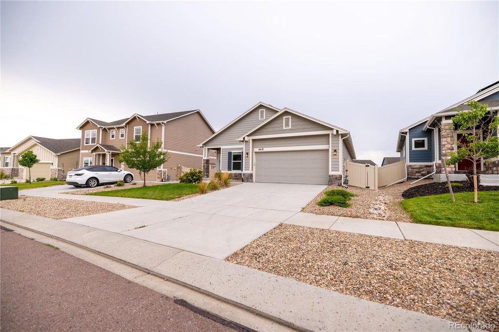 Step into effortless one-level living with this beautifully maintained 3-bedroom, 2-bathroom ranch home in the Enclaves at Mountain Vista neighborhood. This bright and airy home impresses with soaring vaulted ceilings, an open-concept floorplan, and stunning low-maintenance flooring throughout the main living areas. The spacious great room flows seamlessly into the dining area and a contemporary kitchen, perfect for entertaining or relaxed family living. In the kitchen and living room you'll feel the height of the vaulted ceilings. The kitchen boasts granite countertops, dark espresso cabinetry, a large center island with bar seating, and a full suite of stainless steel appliances, including a sleek gas range, and a subway tile backsplash. Enjoy a private primary suite featuring a generous walk-in closet and a spa-like en suite bathroom. The two additional bedrooms are thoughtfully placed for privacy and versatility—ideal for guests, a home office, or hobbies. Additional features include: Laundry/mud room and large pantry. Private backyard access through sliding glass doors to a covered patio. Attached 2-car garage. Easy access to schools, parks, shopping, and major commuter routes. Fenced backyard. Whether you’re, upsizing, downsizing, or simply want main comfort with modern flair, this move-in-ready gem offers it all in a fast-growing, family-friendly Colorado Springs community.