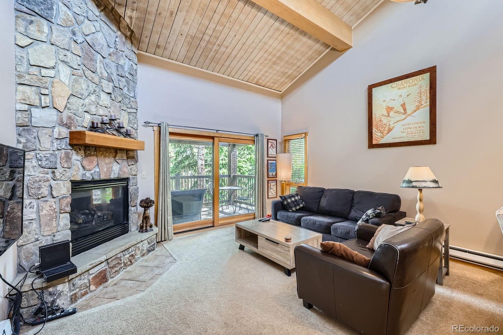 LOCATED IN THE RENTAL ZONE 1 this unit is available for Short and Long term rentals. When you step into this well cared for 2 bedroom 2 bath unit you will feel a spaciousness that other 2bd condos do not offer. This unit is a townhome style (with 2 levels) and as an extra bonus it is also an end unit and to top it off is on the top floor. This is a very well kept sought after complex with low dues, underground parking and access to the Columbine year round pool and hot tubs just steps away from your door. With an easy stroll to the ski slopes, quaint downtown area of Breckenridge and with the bus system across the street this is a great location in the heart of everything. This unit features a unique 2 level floorplan with both bedrooms and bath on the second floor of the building and the living room, open kitchen and another bath on the top floor level of the building. The upper living room level features vaulted ceilings, a cozy rock gas fireplace, private deck carpet and tile flooring, stainless appliances in the open kitchen, huge pantry and lots of extra windows which makes it light and bright. The entry level has a place to hang your coats and remove your shoes with wood and carpet flooring and tile in the bathroom. There is a large primary bedroom with a private deck and a bunk room for the second bedroom perfect for the kids. Nestled in the trees with filtered views you will enjoy the added value of wooded mountain privacy even though you are in a condo. 2 spacious outdoor decks on each level with storage closets for storing your gear make it super convenient. This unit has had some upgrades done in the past but is ready for a facelift to your liking and with it being completely furnished you can start using it and renting it right away and then remodel at your leisure. This is the perfect mountain property for a second home or rental and its ready to be moved into before the snow flies! Take a look today you will not be disappointed.
