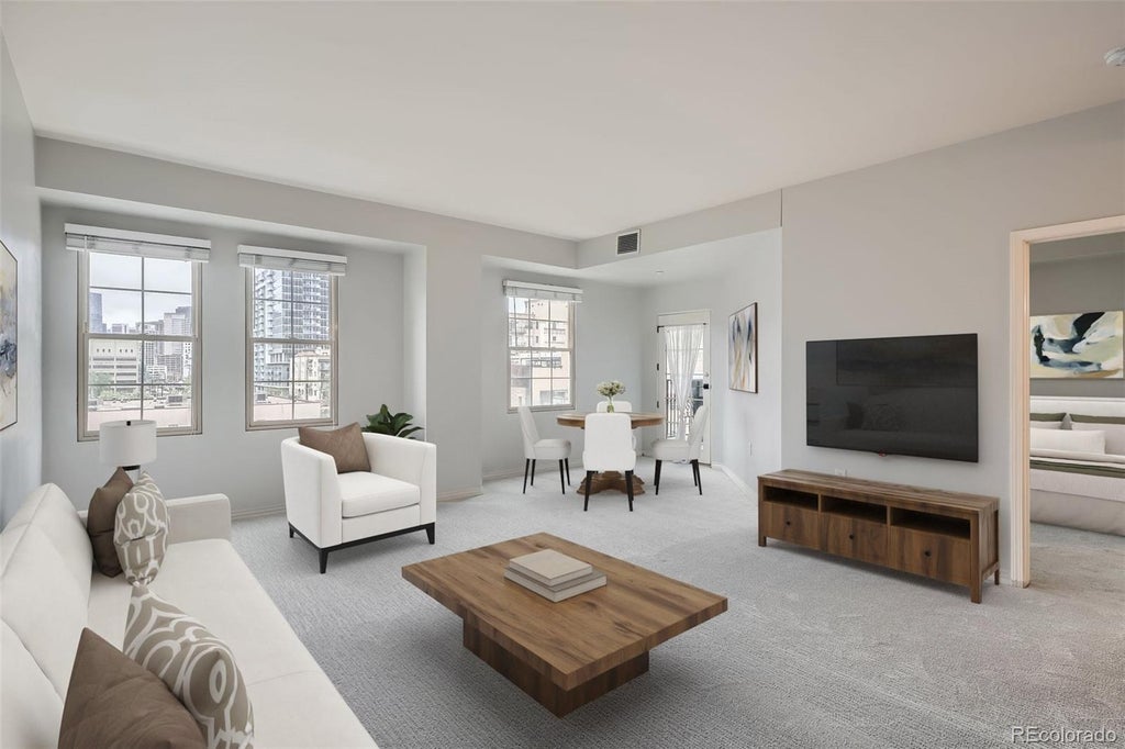 Welcome to The Prado, an elegant residence nestled in Denver’s vibrant and culturally rich Golden Triangle. Surrounded by world-class art and culture, this location is a true haven for creatives and urban explorers—just steps from the Denver Art Museum, Clyfford Still Museum, the ART Hotel, and the iconic Santa Fe Art District. Enjoy the buzz of First Friday Art Walks or unwind along the nearby Cherry Creek Trail. This bright and inviting 2 bed, 2 bath condo features a private balcony with sweeping city views—perfect for morning coffee or evening sunsets. Inside, the open layout includes a kitchen with classic white cabinetry, a laundry closet with a stacked washer and dryer, and newer carpet. The spacious primary suite offers a full bath and direct access to the balcony for a seamless indoor-outdoor lifestyle. A second bedroom provides ample space for guests or can easily be transformed into a home office or creative studio. Additional perks include a secure parking space in the building’s garage, a convenient storage unit on the same floor, and Metropolis Coffee just downstairs for your daily pick-me-up. With Ball Arena, top-rated restaurants, and all the best of downtown Denver just moments away, this is urban living at its finest.