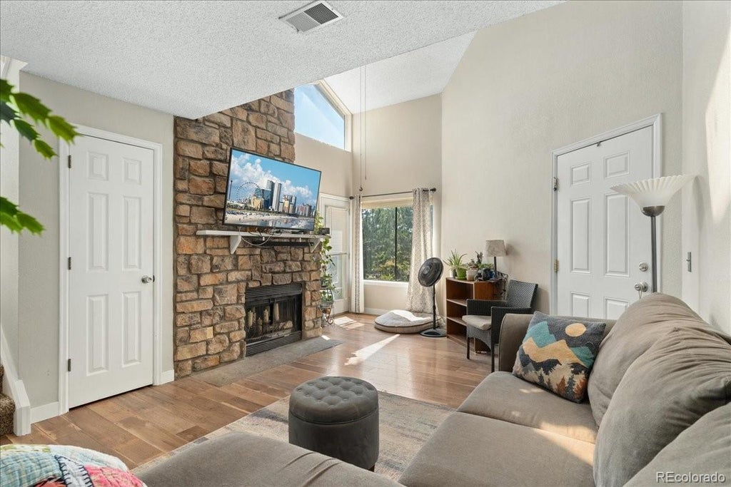 Welcome to Arbor Point! This beautifully maintained corner unit offers an open, light-filled layout that’s perfect for entertaining and truly move-in ready. Soaring vaulted ceilings and expansive south-facing windows flood the space with natural light. The bright white kitchen features stainless steel appliances, a spacious island with room for seating, and a generous dining area that flows seamlessly into the living room with its charming stone fireplace. The primary suite is a private retreat with a spa-like ensuite bath, soaking tub, and its own balcony. A second large loft bedroom and full bath provide flexibility for guests or a home office. Recent updates include brand new James Hardie siding and insulation, new outdoor stairs, a new hot water heater, a brand new main storm door, washer/dryer, garbage disposal, as well as newer laminate wood flooring, and a renovated bath. Ample storage throughout adds even more convenience. Located just minutes from shopping, restaurants, and major highways, this home also offers easy access to Lake Arbor, scenic walking trails, shopping and groceries, quiet neighborhoods, and vibrant community celebrations.