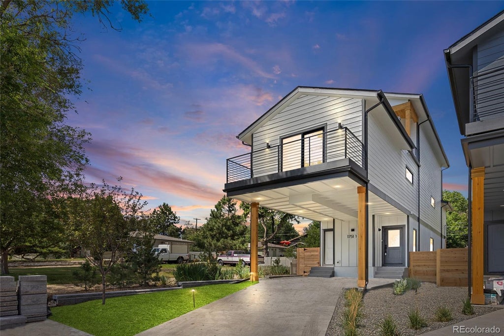 Located just minutes from vibrant Sloan's Lake, this stunning three-story new construction blends modern elegance with exceptional design. Offering 3–4 bedrooms, 4 bathrooms, and remarkable attention to detail, this new home is a rare find. Step into a chef-inspired kitchen featuring rich, two-toned cabinetry, quartz countertops, subway tile backsplash, beautiful wood shelving to display your favorite dinnerware or artwork, peninsula with seating for 4, custom walk in pantry and premium gold/black lighting fixtures. Dining Room is adjacent to the Kitchen to enjoy meals with family and friends. Two spacious living areas, one with a wet bar, provides ample space for entertaining and relaxation. Main Living Room is adorned with gas fireplace with access to the covered patio and lush, green back yard. Upper living space does have a closet, so could be your 4th bedroom. Enjoy spectacular Denver skyline views or peekaboo mountain views from the fabulous rooftop deck, complete with a show-stopping barreled cedar plank ceiling. The luxurious primary suite boasts a private balcony, a tranquil, spa-inspired 4-piece bath and an expansive custom walk-in closet. The two, generous sized secondary bedrooms are great for guests or if you conduct business from home, that perfect work space. This well designed property offers laundry room conveniently located on the second floor plus a wonderful niche to cozy up with your favorite book! Additional highlights include beautiful black framed windows, Unique, yet Genius Carport, extended to protect even your oversized vehicles and EV port, Professionally landscaped, front and back yards, fenced yard, Flexible floor plan, close proximity to downtown, popular local restaurants, boutique shops and so much more. The blend of sleek and modern elegance awaits in these amazing Move In Ready, New Homes.