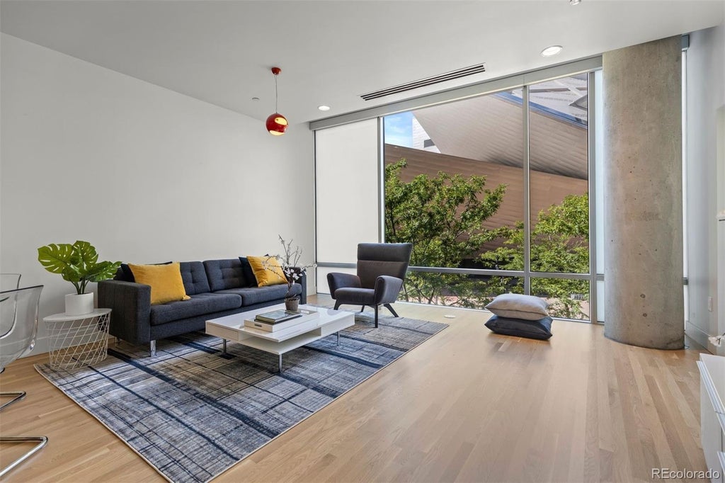 This fully refreshed modern condominium exudes contemporary simplicity as it sits amongst the tree-lined Denver Art Museum Plaza, almost feeling like you’re in a treehouse. Plus the location allows for the enjoyable sounds of the splashing water from the multiple fountains below. This right-size one-bedroom flat provides smart living beginning with an entry which seamlessly flows into the open entertaining space giving into an ample kitchen with a functioning island for prep or entertainment to a dining area that separates the living space which also includes an outdoor deck. Storage is imminse from the foyer double closet to the storage space off of the kitchen which is large enough to double as a pantry and storage facility along with the washer/dryer closet situated right next to it. The bedroom’s capacity is great enough to warrant side tables, dressers, or even a sitting space, while still having an ample walk-in closet with built-ins for easy organization. A community of slightly over 50 flats, makes for an intimate living experience. With privacy and security being paramount, the doorman’s presence is 7 days a week and provides the services a discriminating homeowner would require. Combined with a new state-of-the-art security system the building gives owners an easy feeling of comfort 24-hours a day. The “Secret Garden” contained on the rooftop and unknowing to most people provides a secure, beautifully landscaped area for outside enjoyment, day or night. With a covered pavilion, a kitchen and facilities…it’s a perfect location for a celebration or hosting an unforgettable event. Besides all of this, the unit has a parking space with an installed EV charger and is merely steps to the elevator