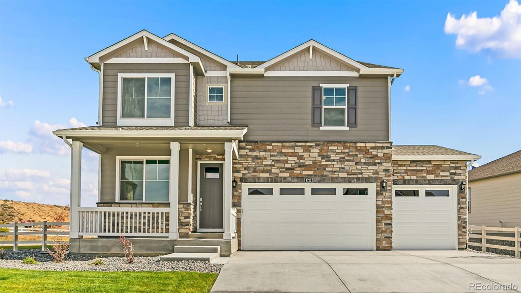 This beautiful two-story home offers four spacious bedrooms, two and a half baths, and a three-car garage across 2,408 square feet of well-designed space. From the moment you step onto the inviting covered front porch, you’ll feel the attention to detail and flow that makes the Holcombe the perfect place to call home. Just off the entry, a flexible study offers the perfect retreat for remote work, hobbies, or homework space. Further down the hall, a powder bath and coat closet provide everyday functionality before you enter the heart of the home — a bright and open great room, cozy dining nook, and a kitchen built for gathering. The chef’s kitchen features shaker-style cabinetry, granite or quartz countertops, a stylish tile backsplash, a large walk-in pantry, and a convenient drop zone by the garage entry. Upstairs, you’ll find four generous bedrooms, including a private primary suite with a spa-inspired bathroom featuring dual sinks, a stand-up shower, a private water closet, and a large walk-in closet ready to accommodate every season of life. Bedrooms two, three, and four share a full bathroom with a tub-shower combination, and the upstairs laundry room makes everyday tasks easier and more convenient. The Holcombe is loaded with high-end finishes like luxury vinyl plank flooring throughout the main level, tile flooring in all wet areas, a tankless water heater, a radon mitigation system, a perimeter drain-tied sump pump, and a central air conditioning unit for year-round comfort. America’s Smart Home technology is included, offering a video doorbell, smart thermostat, smart front door lock, smart light switch, and hands-free keyless entry. Life at Settlers Crossing means enjoying community walking trails, a beautiful park, and an incredible location near Denver International Airport, shopping, dining, and future amenities. ***Estimated Delivery Date: Oct. Photos are representative and not of actual property***