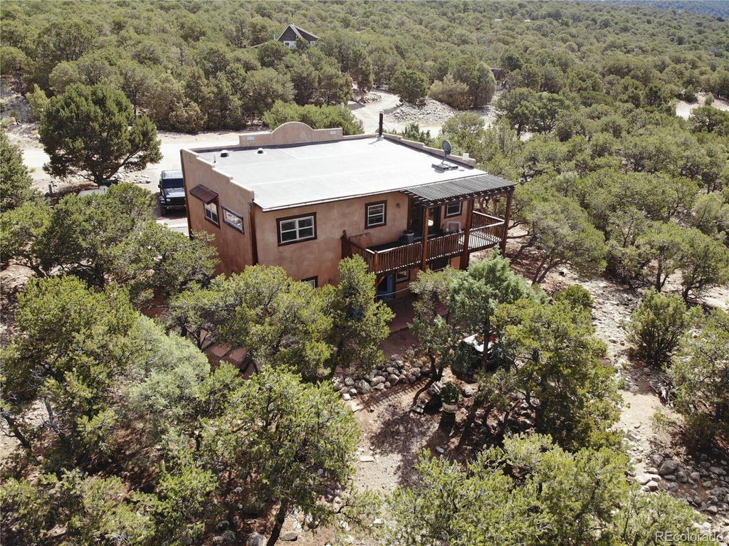 Charming 4 bedroom/2 .5 bath home that was once used as a residence, and walk out downstairs, as a BNB. The downstairs with its private entrance, 3 bedrooms, 1 bath, has a nice living space, and laundry. This unit had a good rental history when it was being used as a BNB on the lower level. The upstairs features a large main bedroom with en suite full bath. The living area, kitchen features an island eating space, and lots of windows. Walk out onto the back covered porch, and the views go on for miles over the tops of trees. This quiet location is a mere minutes walking distance from some of the Spiritual retreats. This Dark Sky Community offers incredible sky watching, and the back deck is a perfect place to set up your telescope. The southwestern style of the exterior has great curb appeal. The Sangre De Cristos rise up in the front, and the valley pans out from the back. The main living area features a wood stove for cozy winter nights. The open island kitchen has ample counter space for the avid chef. Minutes to town, and amenities. 40 minutes to 1 hour to major hot spring resorts. Skiing at Monarch close enough for a day trip. Your dues include snow plowing, and road maintenance to your driveway, and free golf and tennis. There is high speed internet, and 911 serivice. This seller will go VA, FHA.