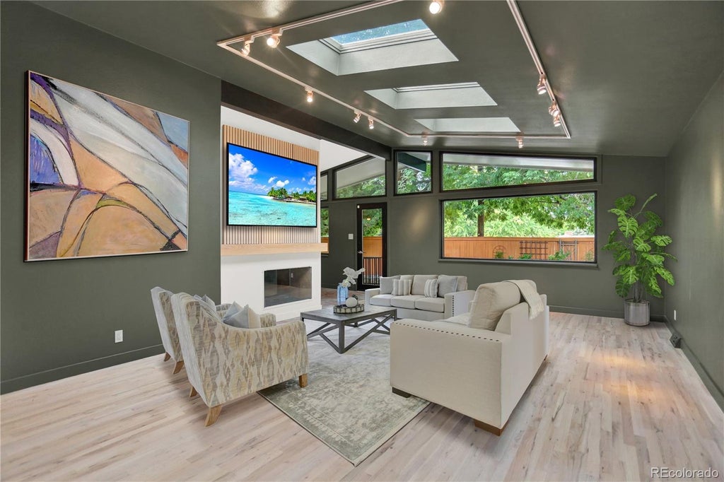 Mid-century modern on a very quiet street in the Krisana Park neighborhood. Close to shopping, Cherry Creek and downtown, too. Lots of space. Vaulted ceilings in kitchen and living room. Three skylights surrounded by track lights in the living room. Refinished hardwood floors on the main level, new paint throughout. Large kitchen with Thermador appliances. Laundry on the main level. Square footage quoted does not include the approximately 300 sf three-season sunroom overlooking the backyard. *Fireplaces are not usable.