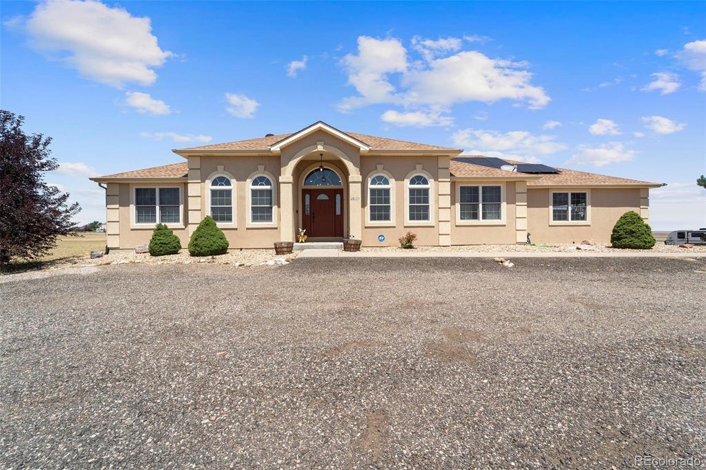 Luxury Living at Its Finest! Just 15 minute commute from I-76, Brighton, and Prairie Center Shopping, this semi-custom Ranch home in Cavanaugh Hills sits on an expansive 3.27-acre lot blending country charm and modern luxury. The open floorplan/vaulted ceilings create an inviting atmosphere, complemented by luxury flooring throughout the main level.The gourmet kitchen features an island/breakfast bar, oversized recessed stainless sink, pantry, ample cabinet space, and granite countertops. Equipped with KitchenAid appliances,electric stovetop/built-in oven/built-in microwave/dishwasher/double-door refrigerator. The main level master bedroom is a private retreat with a walk-in closet /5-piece bathroom, complete w/jetted tub and walk-in shower. Three additional bedrooms and two complementary bathrooms provide ample space for family/guests. One bedroom is currently used as an office and boasts a stylish barn door off the main entrance area.The unfinished basement offers limitless possibilities for entertainment/leisure, with a walkout to the backyard. It includes a utility/storage area for added convenience.Step onto the partially covered deck to enjoy breathtaking Colorado sunrises/ sunsets over the majestic mountains. An additional 21 x 24 deck is perfect for outdoor enthusiasts, overlooking the fully fenced yard where children and small pets can play safely. The backyard also features an 8 x 14 storage shed and artificial grass for low-maintenance beauty.The home includes a 3-car oversized attached garage with a rear door for easy backyard access and a doggy door to the yard and garage.There is ample space to build a shop for storing an RV, boat, toys, or additional vehicles.Located within the Brighton School District, with bus service within walking distance, this horse-friendly community offers an HOA with a community well that includes water. Don't miss the opportunity to own this incredible luxury home—schedule your showing today.