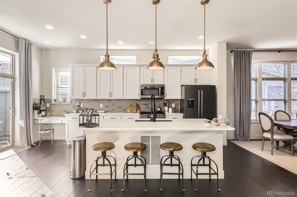 Stunning home, in the highly sought-after Central Park neighborhood, effortlessly blends luxury and meticulous maintenance. With 10-foot ceilings, the open-concept layout creates a spacious, inviting atmosphere. The elegant ebony-engineered wood flooring flows into the living room, where a gas fireplace provides a perfect spot for relaxation. The modern chef’s kitchen boasts sleek quartz countertops with a large island, ideal for countertop seating. Generous cabinet space is enhanced by dovetail soft-close drawers and built-in organizers, while a huge walk-in pantry makes organization a breeze. Completing the gourmet space are new Bosch stainless appliances. Off the dining room, a coffee and wine bar with shiplap backsplash, thick concrete countertop, and wine fridge offers a perfect space to entertain. The main floor also features a spacious office with glass sliding doors, a convenient powder room, and a well-designed mudroom to keep belongings tidy. Upstairs, the luxurious primary suite serves as a serene retreat, complete with a large walk-in closet and en-suite bathroom, hosting a walk-in shower with stylish subway tiles. Down the hall, 2 bedrooms share a nice-sized Jack and Jill bath with a dual-sink quartz countertop. A finished basement offers more space, with a large 4th bedroom and ensuite bath complete with a farmhouse-style double sink, large shower, and beautiful mosaic-tiled flooring. The open recreation area creates space versatility with plenty of room for gathering or workouts. Additional features include a security system, new garage door, tankless water heater, well planned laundry room, and regularly maintained HVAC system ensuring year-round comfort. This home offers the perfect combination of luxury living and functionality. Embrace the Central Park lifestyle with easy access to the Central Park Rec Center, pools, trails, parks, Stanley Marketplace, Eastbridge Town Center, RTD, DIA, Downtown, and a 5 minute drive from Anschutz Medical Center.