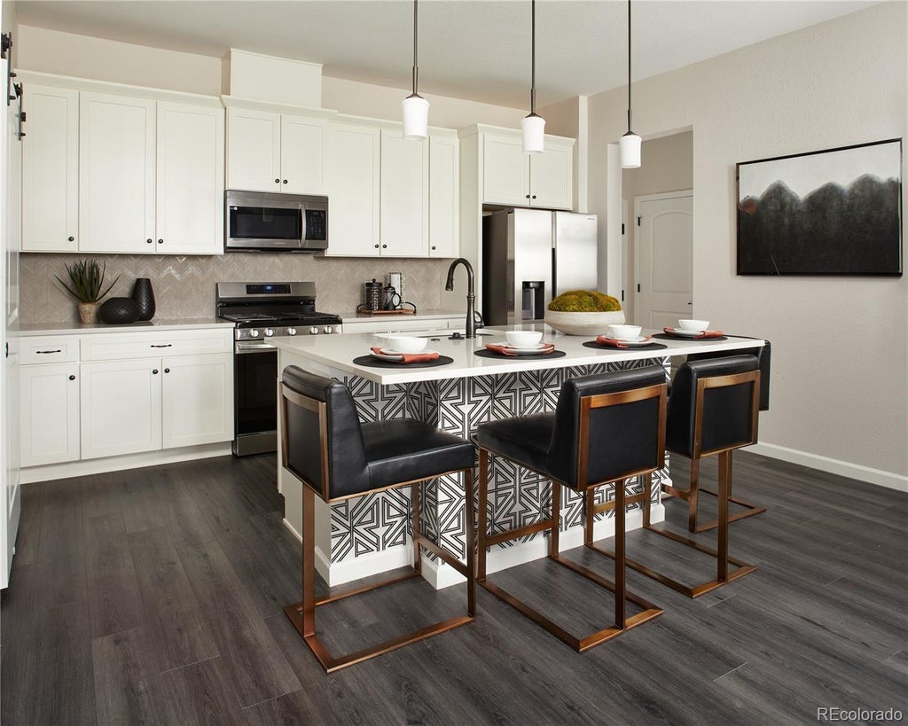 BEAUTIFUL CONDO-READY TODAY - Brand new condo with private stairs to extra-deep garage plus driveway parking. This sleek and modern unit faces east to welcome the morning sun and features our new Colorado Complete finishes including beautiful quartz countertops, gray soft-close cabinets, stainless steel appliances (including refrigerator), and full sized front-loading washer and dryer. High quality, easy care LVP flooring in a rich hue flows throughout the unit. Large kitchen island seats 4-5 and features an oversized stainless steel sink and semi-professional Kohler faucet. Brushed nickel hardware and fixtures add to the contemporary feel. Oversized subway tile in both baths and dual lighted mirrors in the spacious primary bath. This unit is move-in ready including blinds, air conditioning, Navien tankless water hearter, Kwikset Smartcode deadbolt and more. Easy access to E-470, I-70 and DIA. Take advantage of the great financing incentives available through our affiliated lender and get into a brand-new home for less than you would expect! Sales Center open everyday except Mon and Tues. Visit www.lokalhomes.com for more information. Photos are an example, not the actual unit. Buyer shall be responsible for verifying property taxes as there is currently no available tax information for the units at the assessor's website.