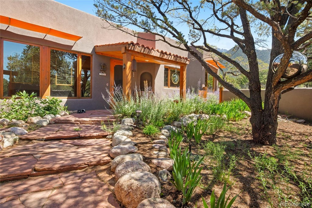 Welcome to "The House with No Corners," a 3bd, 2ba masterpiece designed by Sacred Geometry architect David Yarbrough. Built as a result of a dream and envisioned originally with a drawing in the sand, it uses Rastra insulated concrete forms on a slab below freeze level for excellent climate control. Rounded edges and sculpted arches are made from the Rastra, and covered in skip trowel plaster, separating rooms throughout the home. Oversized windows offer stunning Sangre De Cristo Mountain views, with handmade interior doors by a local artist. The atrium, once an art gallery for Yarbrough’s watercolors, features large south-facing windows for passive solar gain, complementing in-floor radiant heat and slate floors. The living room centers on an antique round fireplace, while the kitchen is visually designated by unique cross shaped Spanish tiles and includes dark wood cabinets, stainless steel appliances, and a large mountain-view window. A screened porch off the dining room is ideal for summer dinners. The third bedroom/flex room was once used as an architecture office and a real estate office, and now is used as a bedroom. It includes water/sewer access in the floor for a potential future bathroom. Down the hallway, a small bedroom with exterior entrance shares a hallway full bathroom. The primary suite includes a meditation room based on the square root of Pi to amplify the energy inside, a large custom closet built into the hallway, and a primary bathroom with a soaking tub overlooking natural land and a valley view. The primary bedroom relays the feeling of being nestled in trees. The roof, engineered for wind and snow, was replaced in 2022. Situated on 6+ acres in Baca Grande Chalet I, with a two-car garage, lawn, and fenced gardens, this secluded cul-de-sac retreat is a must-see virtual tour.