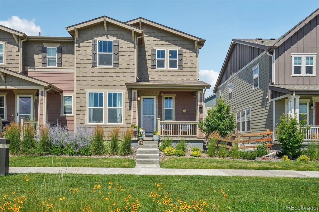 Welcome to this stunning duplex-style home in the highly sought-after Flatiron Meadows community of Erie. Perfectly positioned across from a lush green space, scenic trails, and the neighborhood playground, this home offers both vibrant community living and peaceful surroundings. A charming front porch with a sitting area and beautifully landscaped yard invites you to relax and enjoy the view. Step inside to a welcoming entryway with a dedicated office to the left, enclosed by elegant French doors—ideal for working from home. Continue into the heart of the home where the open-concept living, dining, and kitchen areas offer a seamless flow and abundant natural light. The kitchen features stainless steel appliances, a large island with seating, and a spacious pantry, making it perfect for both everyday living and entertaining. The dining area opens through sliding glass doors to a private side patio, ideal for effortless indoor-outdoor living. An attached two-car garage adds convenience on the main level. Upstairs, enjoy a versatile loft space that can be used as a second living area, playroom, or reading nook. The primary suite is a true retreat, complete with a private five-piece en-suite bath and a walk-in closet. Two additional bedrooms, a full bath, and a convenient upstairs laundry room complete the upper level. Enjoy a spacious unfinished walk-out basement, perfect for storage or future expansion to suit your needs. Flatiron Meadows is a friendly and lively community known for block parties, neighborhood gatherings, and well-kept surroundings—all while maintaining a quiet and tranquil atmosphere. With easy access to highways, schools, shopping, dining, and more, this location offers the perfect balance of peaceful living and everyday convenience!