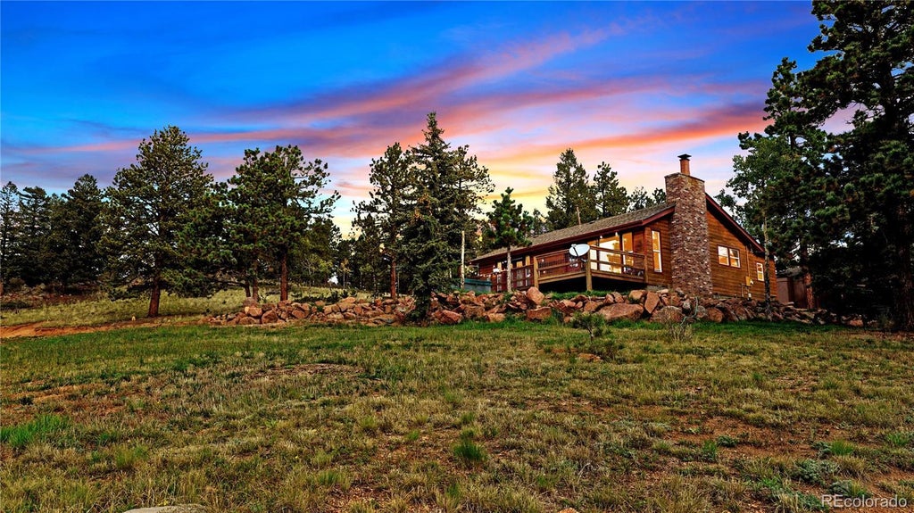 This charming 2-bedroom, 1-bath retreat in Deer Creek Valley Ranchos offers breathtaking views of the surrounding mountains and a taste of the ultimate Colorado lifestyle. The home features a sleek, efficient kitchen and a cozy living room with a striking stone fireplace and wood-burning insert. Pitched ceilings with exposed beams add character and warmth. Step through French doors from the primary bedroom onto a spacious deck—perfect for morning coffee or evening stargazing. Below, unwind in the hot tub as you take in the natural beauty from all directions. The primary bedroom also offers a generous walk-in closet for your personal storage needs. Outside, you'll find nearly 5 acres covered with Aspen and pine and a detached 2-car garage for added storage and workspace. There's plenty of space for horses and room to park your motorhome and equipment. You'll also find a fenced chicken coop and unusual rock outcroppings. Whether you're seeking a peaceful getaway or a full-time residence immersed in nature, this property delivers a rare blend of privacy, functionality, and mountain charm. View the pictures and virtual tour and call today for your personal showing!