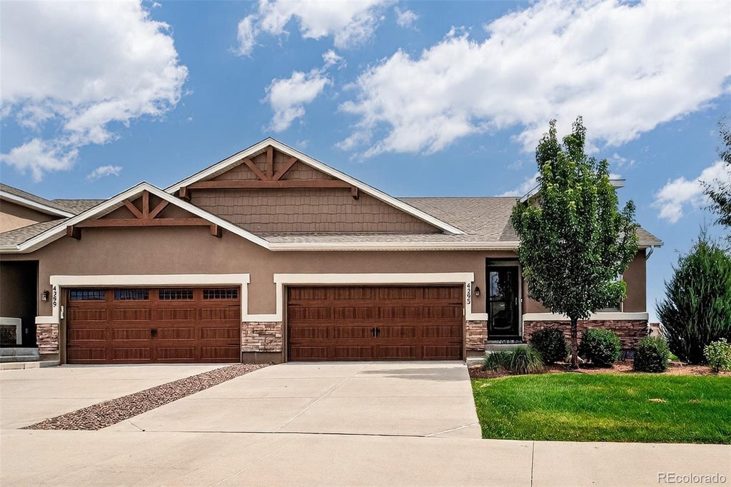 Welcome to low-maintenance living in the desirable Enclaves at Mountain Vista Ranch! This 2018 ranch-style patio home offers 3 bedrooms, 3 bathrooms, and over 2,300 sq. ft. of finished space, thoughtfully designed for both comfort and convenience. Step inside to an inviting open-concept main level featuring vaulted ceilings, abundant natural light, and a cozy gas log fireplace that anchors the living room. The kitchen blends style and functionality with a breakfast bar, granite countertops, stainless steel appliances, and plenty of cabinet space for storage. The spacious main-level primary suite offers a private retreat with a walk-in closet and an en-suite bath. An additional main-level office with French doors creates the perfect environment for remote work, a reading nook, or creative space. Downstairs, the finished basement expands your living options with a generous family room, a wet bar for entertaining, two additional bedrooms, a full bath, and an oversized utility/storage room. Outdoor living is just as enjoyable, with a private back patio ideal for relaxing mornings or evening gatherings and larger yard space. Residents also enjoy access to community walking trails, parks, and playgrounds—perfect for an active lifestyle. Located near shopping, dining, and District 49 schools, with quick access to Powers Blvd. and Marksheffel Rd., this move-in ready home combines modern finishes, a functional floor plan, and an unbeatable location.