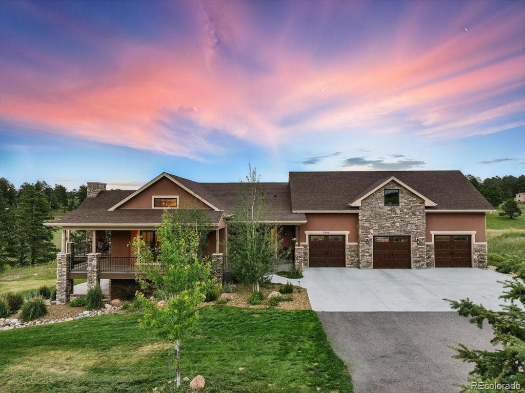Welcome to this stunning custom-built home nestled on nearly 3 acres of mature trees and open space in a tranquil, high-end neighborhood. Designed by one of the top local architects in 2021, this residence offers a perfect blend of privacy, functionality, and luxurious finishes. Enjoy outdoor living on a wrap-around deck featuring a gas fireplace, steel railing with a gate, providing a perfect setting for relaxing or entertaining amidst nature. The thoughtfully designed open concept floorplan includes a spacious great room, gourmet kitchen, and dining area—ideal for gatherings and everyday living. The gourmet kitchen is equipped with JennAir appliances, including an induction cooktop, double oven, oversized refrigerator, and a beverage fridge in the adjacent coffee bar. The large mudroom and laundry area add practicality, while the oversized four-car garage offers and additional 1,200 sq ft above of versatile space—ideal for storage or an office, craft room, or game area once finished. Custom windows with sound dampening glass to block any outside noise with motorized blinds. Retreat to the spa-like master suite, featuring a two-person soaking tub and full tile wall for a touch of luxury. Main level living is enhanced with LVP flooring throughout the common areas and staircase, with plush carpeting in the lower bedrooms. The main level also includes a second bedroom with an attached bath. The walkout lower level hosts three additional bedrooms and two bathrooms, ideal for family or guests. Set on a peaceful cul-de-sac, this home offers a serene setting just less than an hour from Denver. Whether you're seeking privacy, luxury, or convenience—this property combines all with a high-end touch and outstanding location.