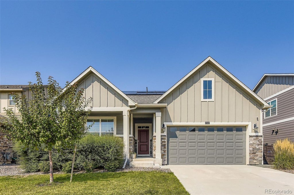 Better Than New – Move-In Ready Ranch Home! This beautifully maintained ranch-style home offers the perfect blend of comfort and convenience with three bedrooms, two bathrooms, and a dedicated office. Designed for easy one-level living, the open layout flows seamlessly from room to room. The inviting living room features a cozy gas fireplace, ideal for relaxing evenings. The kitchen is a true highlight with a pantry, granite countertops, stainless steel appliances, and a spacious island perfect for meal prep or casual dining. Just off the kitchen, the large dining room opens to a covered patio, making indoor-outdoor entertaining effortless. Enjoy the charm of a covered front porch, beautiful landscaping, and a fully fenced yard that offers both privacy and outdoor living space. The laundry room is good sized and includes a washer, dryer, and a custom storage cabinet with storage space for an ironing board. With a neighborhood park just down the street and the Community Center conveniently nearby, this home offers not only comfort inside but a wonderful lifestyle outside as well. Its location near DIA, I-70, shopping, and more makes it ideal for modern living. Don’t miss out—schedule your showing today!