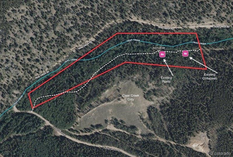 This 5 Acre parcel is a one of 7 Trail Creek Area Mining Claims offered just outside the Rocky Mountain Gateway town of Idaho Springs, Colorado. The larger collection of all 7 individual claims totals 32.042 acres with one additional 5.16 ac offering (MLS# 6621345) and the remaining 5 contiguous claims (MLS# 9105870) offered together at 21.882 acres. The 5 acre “Rustler MS” parcel lies at the end of Trail Creek Road from about .3 mile to .6 mile from the end of the county maintained portion. The Creek traverses the entire length of the property with cascading falls and pools within the densely forested landscape and a 2 track path also runs the length with access from the upper west end where Trail Creek Rd transitions to a Forest Service Rd. An abandoned rustic cabin exists upon the property and could perhaps be renovated to habitability. The collapsed remains of another old cabin provide a window in to the rich past of the area. The neighboring parcel to the south is owned by Clear Creek County providing an added layer of privacy from other landowners. For 3 generations the ownership family has enjoyed these lands as a place to retreat, camp and recreate; from the lovely trickling stream of Trail Creek upon the “Rustler MS” parcel to the expansive rocky mountain views offered from the middle clustered parcels and the high vantage point of the “Maximum” parcel.