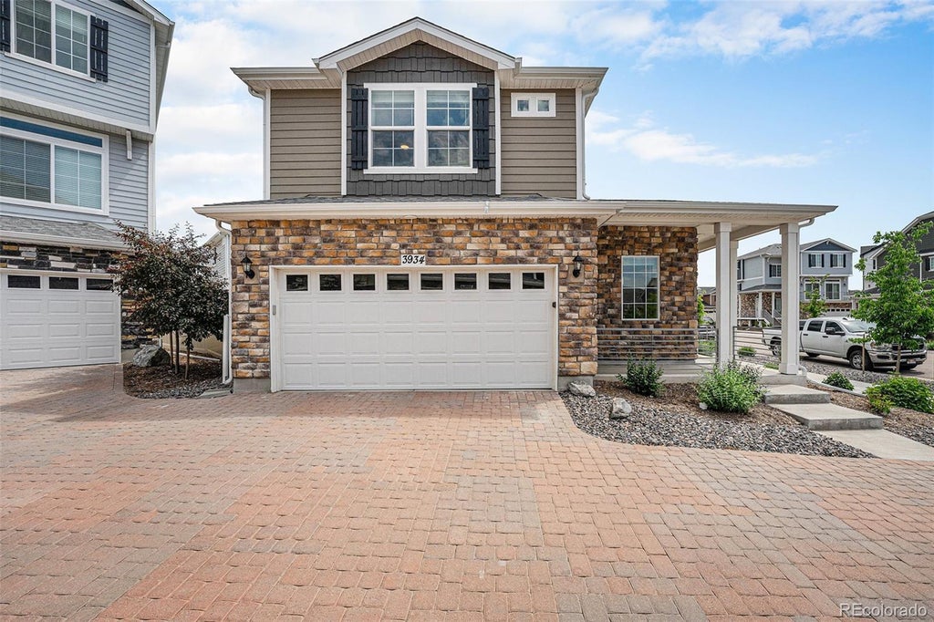 Discover the perfect blend of style, comfort, and convenience at 3934 N Quatar Ct in vibrant Green Valley Ranch East. This thoughtfully designed home offers inviting spaces, modern finishes, and an ideal location that makes everyday living feel effortless. The main level is dressed in luxury vinyl plank flooring and features a spacious family room with soaring vaulted ceilings, recessed lighting, a lighted ceiling fan, and expansive windows that flood the space with natural light. The kitchen is ready for both everyday meals and entertaining, complete with granite counters, stainless steel appliances, gas range, microwave, refrigerator, dishwasher, disposal, tiled backsplash, pantry, and a central island perfect for gathering. Upstairs, plush carpeting flows through all the bedrooms. The primary suite is a peaceful retreat with a lighted ceiling fan, walk-in closet with built-in shelves, and a sleek en suite bath featuring tiled floors and walls, granite counters, and extra shelving. The second bedroom also offers its own private full en suite with granite counters and stylish LVP flooring. The laundry area is outfitted with shelving and durable flooring for function and ease. Enjoy added comfort with central A/C, rocker light switches throughout, and a fully drywalled two-car garage with ceiling storage and an automatic opener. Step outside to a fully fenced backyard with a concrete patio, charming pergola, and sprinklers in both the front and back. The exterior features low-maintenance cement siding, a composition roof, and a welcoming covered front porch. A brand new Class 4 Impact Resistant Roof is scheduled to be installed in July 2025. HOA perks include front yard landscaping and snow removal right up to your front porch and garage door. With quick access to DIA, I-70, shopping, dining, and parks, this home is perfectly positioned in one of Aurora’s fastest-growing communities.