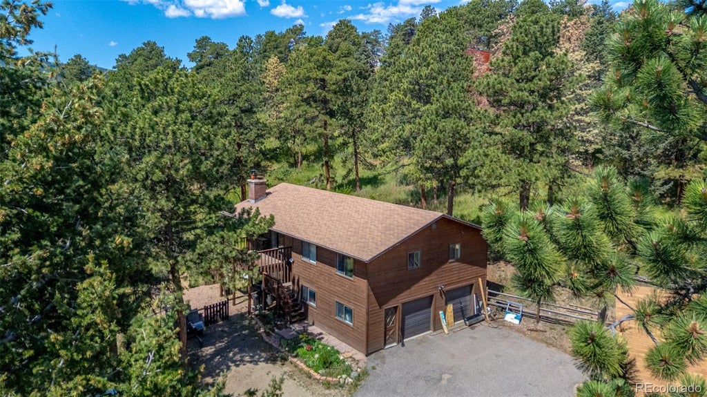 Horse READY! 1-acre lot with breathtaking mountain views! You’ll be drawn in by the charm and peaceful energy of this one-of-a-kind home. Inside, warm wood floors welcome you into a cozy living room featuring a fireplace, perfect for chilly evenings. Need more space to gather? Check out the family room, where a second fireplace adds to the inviting ambiance. Whip up delicious meals in the beautifully appointed kitchen, boasting built-in appliances, granite counters, wood cabinetry, a stone backsplash, and classic tile flooring. The dining area is ideal for hosting special occasions or casual everyday meals. At the end of the day, unwind in the main bedroom offering its own closet and a spa-inspired private bathroom complete with a soaking tub and tile finishes on the floor, counters, and walls. Looking for even more versatility? The lower level features a bonus room that could easily serve as an additional bedroom, media center, game room or whatever suits your lifestyle! Outside, sip your favorite beverage on the deck as you soak in serene mountain views. Bring your horses, toys, or hobbies as the property includes a large barn with a loft area, plus a 2-car garage for all your storage needs. Whether you're seeking room to roam, space to entertain, or a quiet place to make your own home, this gem has it all. Fencing already done, all you need to do is bring your horses and move in!A peaceful combination of mountain living in the Foothills with easy access to all amenities, schools, shopping, trails, open spaces & min to 285. Don’t miss this rare opportunity to own a slice of country living with all the modern comforts. Your dream lifestyle awaits!