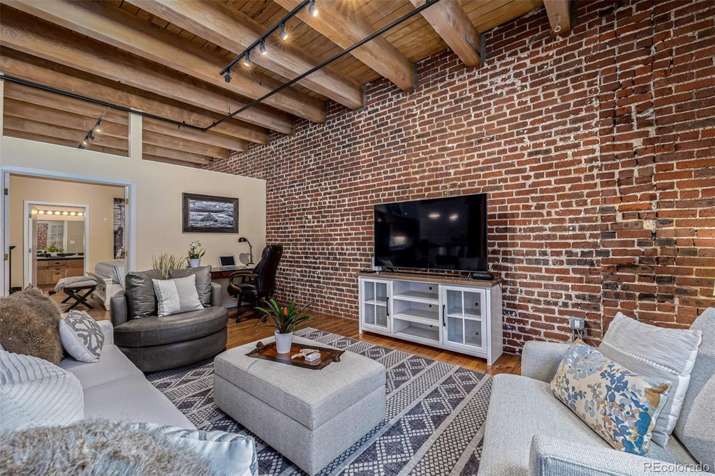 Quintessential Historic Franklin Loft with soaring ceilings and open concept. You can sense the history surrounded by Gorgeous wood beams and brick Walls. Enter a gallery style foyer with amazing wall space for large scale art. Upon entry there is a non-confirming 2nd bedroom, great for guests or a designated office space along with laundry closet and a 3/4 bathroom. Past the entry hall is the great room perfect for formal dining, open kitchen, office desk and space for daily living and entertaining. The perfectly scaled furniture is negotiable. New oversized windows with custom blinds keep out the urban hum of LODO. Enjoy grilling on your own balcony. The large primary bedroom is equipped with walk in closet and 4-piece bathroom with updated walk-in shower. 1 reserved parking space in garage and storage space. Franklin Lofts offers amazing walkability to restaurants and entertainment, 2 blocks to Coors Field and Union Station.