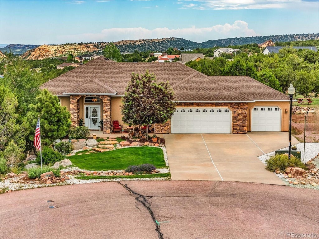 Views and sanctuary await you at this gorgeous Dawson Ranch home. Situated at the very end of a quiet cul de sac, it was built with both beauty and functionality in mind. This ranch-style home with a finished walk-out basement is 4100 square feet total, with three bedrooms and two bathrooms on the main floor, and 2 bedrooms and another bath down. Details abound inside and out. Every bit of the landscape of the property has been meticulously appointed with grass, flowers, shrubs, trees, lighted pathways and places to linger and enjoy. Upon entering, you'll find a beautiful tile inlay design at your feet. The custom kitchen with an abundance of cabinets, cupboards and counterspace, also boasts enough space for a small breakfast table. A two-sided gas fireplace separates the formal dining room from the living room, complete with lovely views of the mountains to the north. The primary en suite bath is a highlight with its over-sized corner soaker tub surrounded by large plate glass windows that look out into the aspen trees. The downstairs feels like a world unto itself where you can spend hours in a family room/TV room. A sliding glass door downstairs takes you out onto a tiled patio, where you will find sanctuary and a beautiful water feature. Three-bay attached garage. Central air. Two decks. Inground sprinkler system. The lot next door is also for sale by the same owner. This is the one you've been waiting for. Come take a look today!
