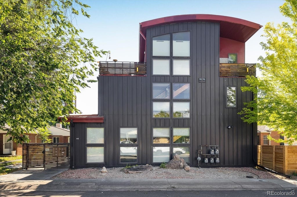 A townhome that couples modern styling with comfortable living, this distinct home features a well-designed floor plan with over 1,650 finished square feet on three levels, including 3 bedrooms and 2.5 bathrooms. Tucked into Sloan’s Lake’s vibrant West Colfax Corridor, you can walk to the lake park, watch a movie at Alamo Drafthouse, go for coffee at Dunkin’, enjoy a sweet treat at Little Man Ice Cream, or pop by the Edgewater downtown for a beer at Joyride Brewing. For those who work in downtown Denver, there are convenient nearby public transit options as well as protected bike lanes. Unit 103 has character and thoughtful details, such as interior wood trim and wood flooring in the bedrooms. On the main level, you’ll find an open, spacious layout with a kitchen counter island that seats 4–6—perfect for cooking with friends—a light-filled living room, a built-in cocktail bar, and a powder room. A bright reading nook on the second floor offers space for respite and relaxation. The primary bedroom is located on the third level and offers partial views of Sloan’s Lake from the rooftop deck, accessible from the upper level lofted bedroom. This bright and airy third-level bedroom could also serve as a second living space or a fantastic home office, as two additional bedrooms and a full bathroom are located on the second level. An additional energy bonus, this house comes equipped with a fully owned solar panel system to lower monthly power bills. This is a wonderful townhome with excellent walkability and has been meticulously maintained by the current owners.