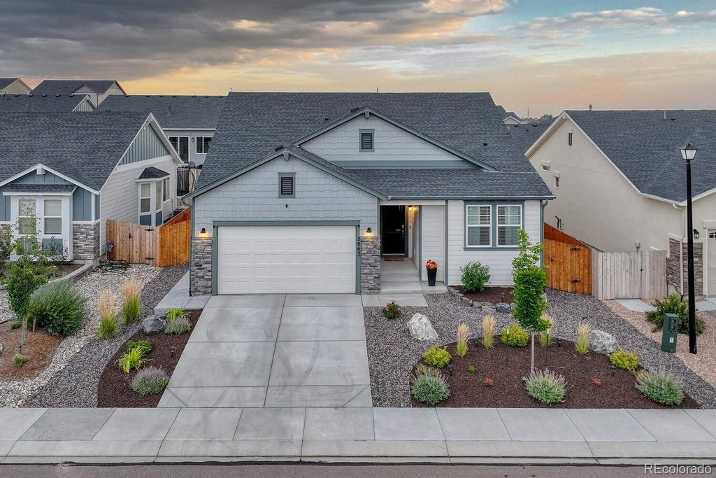 Begin your next chapter in Hannah Ridge! Classic Homes’ Celebration floorplan is loved for convenient main level living and high ceilings. With 4 bedrooms, 3 bathrooms, and a 2 ½ car garage, this excellent quality property is ready for you! Open concept kitchen is an entertainer’s delight with coffee station and island with bartop seating. Tile backsplash, granite counters, gray cabinets, gas range, stainless steel appliances, can lighting, and pantry make this the total package! Luxury vinyl plank floor runs from entry through great room. Living room offers gas fireplace with stone surround, mantle, built-in shelves, and a wall of full height windows. Extended primary suite includes walk-in closet and barn door to en suite oasis. Primary bathroom has beautiful patterned tile floor, double vanity, and oversized shower with bench and herringbone details. Second bedroom on main is served by full bathroom. All bathrooms feature undermount sinks, granite counters, gray cabinets, tile floors, and mini subway tile surrounds. Ceiling fans in all bedrooms. Drop-zone entry and laundry with washer, dryer, and shelving complete the main level. Basement rec room has space for watching movies and playing games, plus full bar with sink, wine rack, and mini fridge. Two more bedrooms and an oversized full bathroom complete the basement. Garage provides ceiling racks, one extended bay for storage, and exterior door to yard. Upgrades include Ring doorbell, Nest thermostat, smart switches and bulbs, whole-house water softener, reverse osmosis purifier, and central A/C. Exterior features customizable permanent trim lights, professional landscaping, extended patio for entertaining, bountiful raised garden beds, privacy fence, and solar string lights to perfect the ambiance. Hannah Ridge offers D49 schools, pocket parks, trail with mountain views, and quick access to shopping, dining, and entertainment along Marksheffel and Powers. Treat yourself to the one you really want to call Home!