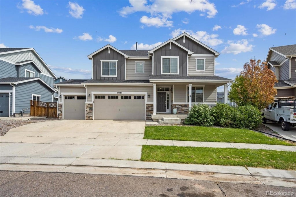 Here is your opportunity to own a timeless 2-story home with a 3-car garage in The Village at an affordable price! Step into style and comfort in this beautifully appointed and spacious home featuring a gourmet kitchen, open floor plan and gleaming hardwood floors. The gourmet kitchen is a chef’s dream, complete with stainless steel appliances, a stylish backsplash, spacious island, and a walk-in pantry. A main floor bedroom offers flexible living options, while the mud room with built-in cubbies keeps everything organized. Upstairs, you'll find a cozy loft and three generously sized bedrooms, including a luxurious primary suite with dual sinks and a walk-in closet. Enjoy year-round comfort with ceiling fans and central air. Outdoor living shines with a covered front porch and a covered back patio enhanced by ambient lighting—perfect for entertaining. The fully fenced, oversized backyard includes a dedicated dog run and offers endless possibilities. Plus, the full unfinished basement is ready for your personal touch! The Village has its own neighborhood park, which is just a short walk away. Lots of opportunities for outdoor recreation nearby, like biking trails, Barr Lake State Park, and the Buffalo Run Golf Course. Quick access to I-76 and E-470. Close to restaurants and shops. Don't miss out on this one! Schedule your private showing today!