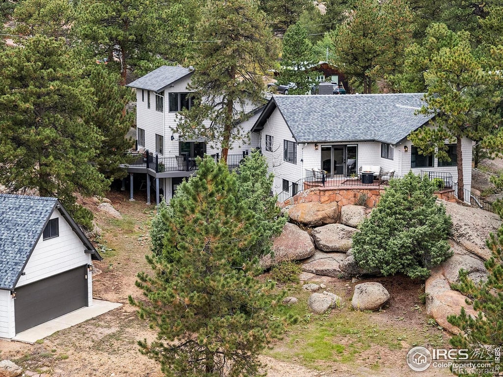 Do you prefer location, views or walkability? This incredible mountain retreat has all three! Stunning views of Long's Peak, Twin Owls and a peekaboo of Lake Estes. Rare estate with 1.1 acres. Walkable to charming downtown Estes Park, one minute drive to the famous Stanley Hotel and 4 miles to Rocky Mountain National Park entrance. 3 bedrooms, ALL ensuite! New flooring throughout. Main kitchen has all new cabinets, appliances and gorgeous countertops that open to living room, beautiful fireplace and dining room. Brand new expansive deck, with hot tub included, to enjoy the gorgeous views & abundant wildlife! Bonus cafe area is equipped with another refrigerator, dishwasher and microwave for easy access off the spacious family room that boasts another cozy fireplace and additional stone deck. 5 car garage, impressive rock outcroppings and proximity are just a few of the many WOWS that you must experience in person! Furnishings available. Only 2nd time on the market, as this home is truly a keepsake! Hurry before the owners change their mind!!