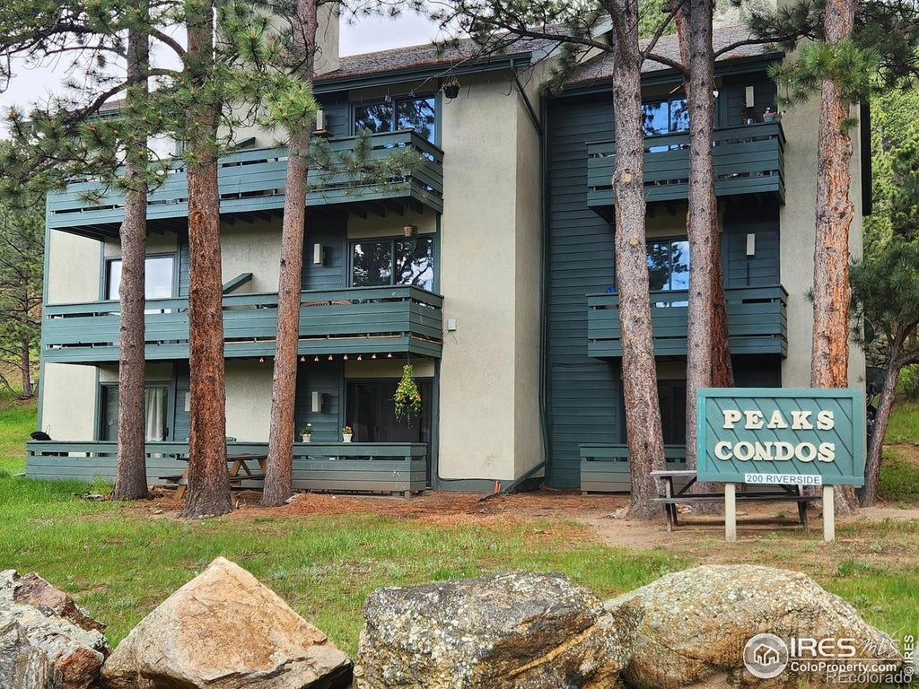 In the heart of Estes Park this fabulous opportunity awaits! Very low HOA Fees! Surrounded by large mature trees, a green and lush lawn that invites Elk and wildlife almost daily to lounge and bask in the beauty of this property and so much more for you to enjoy here. Walking distance to plenty of activities including restaurants, entertainment, challenge course, Brewery, and the Post Office. This true 1 bedroom condo lets you walk right in to comfort. The open living room and ample sized kitchen are perfect for preparing full meals, hosting friends or viewing the mountains and city life passing by. The private patio opens right up to the enchantment of the snow capped mountains in the winter and breezes of fresh air passing through the property. Windows have been upgraded too for efficiency and to peek at that lovely view and allowing plenty of natural light to flow in and warm. This property offers a huge bonus of an in unit laundry and wash basin room specifically designed for convenience. No more visits to the laundromat! Very few steps to enter the property from the upper parking lot, otherwise this home is all on one level once inside. The property has been used for long term rental in the recent past if income instead of primary use is your desire. Minimum Lease term applies. No Short term rentals. Schedule your showing today! This property won't last long at this price!