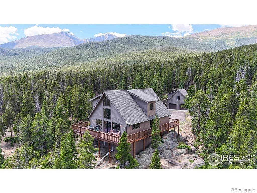 Magical one-of-a-kind retreat, perfectly set on 5.3 private acres bordering Rocky Mountain National Park. With 360-degree views of Longs Peak, Mount Meeker, and Twin Sisters, this property is as spectacular as it is rare. Rebuilt in 2016 by Aldrich Builders, the main home was designed for year-round enjoyment. A soaring great room with floor-to-ceiling windows frames panoramic vistas, while the open floor plan flows seamlessly into a spacious kitchen featuring brand-new KitchenAid stainless-steel appliances, abundant storage, and hardwood floors. The main level also includes a comfortable bedroom and bath, while upstairs you'll find a versatile loft and a serene primary suite with bathroom and walk-in closet. Step outside to a wraparound deck and take in the inspiring mountain views. Just steps from the main house is the oversized 2-bay garage (added in 2014) that includes a living space above with its own living/dining/kitchen area, office with closet and 3/4 bath, ideal as a private guest retreat or creative workspace. Surrounded by dramatic rock outcroppings and towering trees, this property offers unmatched privacy while being minutes from world-class hiking, wildlife, and the charm of Estes Park. Downtown Estes Park: 17 Minutes. Lily Lake: 5 Minutes. RMNP Beaver Meadows Entrance: 20 Minutes. RMNP Wild Basin Trailhead: 20 Minutes. Allenspark: 13 Minutes. Furniture and furnishings are negotiable, offering the opportunity for a turnkey mountain getaway. A special place where nature, privacy, and comfort come together-don't miss your chance to own this magical Rocky Mountain retreat. Showings to begin September 2.