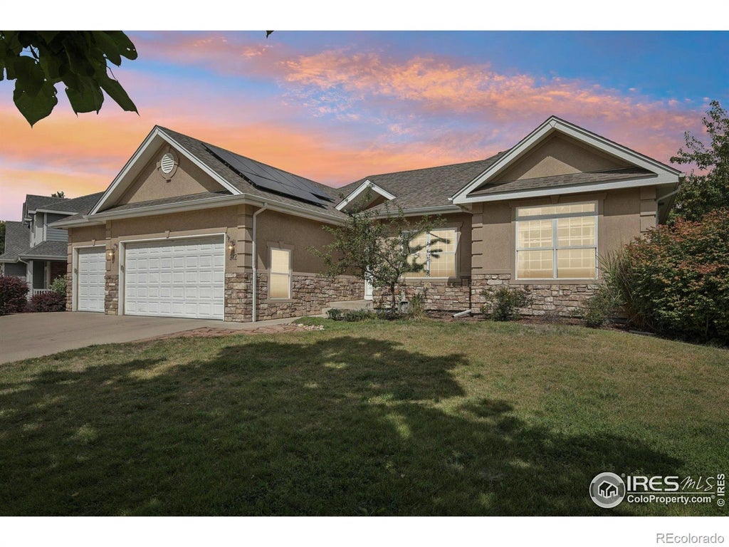 $5000 in seller concessions offered to buyers for closing costs or rate buydown. Welcome to 212 N 54th Ave-an exceptional 5-bedroom, 3-bath ranch-style home in Greeley's desirable Forest Glen at Kelly Farm. With over 3,500 finished square feet on a beautifully landscaped lot, this home offers refined comfort and everyday functionality in one elegant package.The open-concept main level is designed for both connection and relaxation, featuring vaulted ceilings, soft natural light, and a warm blend of newer carpet and hardwood flooring. The living room centers around a gas fireplace, while the spacious kitchen offers generous prep space, an eat-in layout, and easy flow into the dining area-perfect for entertaining or casual nights in. The fully finished basement expands your living space with a large rec room, wet bar, two additional bedrooms, and a gym. An electric fireplace adds ambiance, and upgraded lighting, high-mounted outlets, and a dedicated garage circuit enhance function and flexibility throughout. Step outside to enjoy the thoughtfully designed backyard retreat, complete with a covered patio, custom lighting, and a built-in granite table feature ideal for dining and entertaining under the Colorado sky. The oversized 3-car garage features fresh epoxy flooring and built-in workbenches for hobbyists and gearheads alike. Sustainability meets style with an owner-owned solar panel system-keeping electric bills astonishingly low, around $9/month.Located just minutes from parks, schools, shopping, and Greeley's vibrant cultural scene, this home combines quiet neighborhood living with everyday convenience.