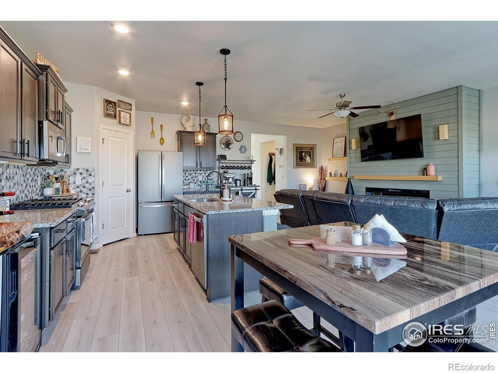 Final price reduction, well under market! Just 16 miles northeast of Brighton, discover this stunning ranch style home in the peaceful town of Keenesburg. Built in 2020 and thoughtfully upgraded throughout, this home blends modern comfort with custom touches you'll love. Step inside to find wood look laminate flooring flowing through most of the main living areas, with plush new carpet in the two secondary bedrooms. The kitchen shines with updated stainless steel appliances, granite countertops, a full tile backsplash, and plenty of space to cook and entertain. The highlight of the family room is a custom-designed fireplace and entertainment wall, soaring from floor to the 9-foot ceilings, both functional and beautiful. The spacious primary suite features a dream bathroom and large walk-in closet, creating the perfect retreat. Outside, enjoy a 19'x16' patio wired for a hot tub, a fully fenced backyard with raised garden beds, and an extra concrete pad with a walkway that connects to the front of the home. The two car garage is fully finished with hot and cold water hookups-ideal for a dog wash or easy car care. This move-in ready home offers smalltown charm, thoughtful upgrades, and modern convenience all just a short drive from Brighton or the Denver Metro area and is priced to sell quickly.