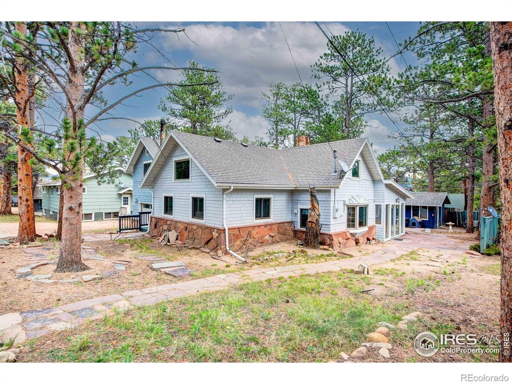 Now's your chance to own not one, but two homes in the heart of Estes Park. A spacious main residence plus a charming guest cabin, perfectly positioned on a beautiful, wooded lot near downtown and Rocky Mountain National Park. Whether you're dreaming of a full-time mountain retreat, a multigenerational getaway, or a smart income opportunity, this property checks every box. Step inside and discover how traditional Rocky Mountain design meets a thoughtfully crafted contemporary addition. The original portion of the home, built with custom-milled knotty pine walls and ceilings, exudes warmth and nostalgia, a true nod to Estes Park's rustic roots. Wander through the cozy main level and up to the lofted A-frame bedroom with built-ins and bonus den or office space. Then, seamlessly transition into the modern upper addition, where vaulted, wood-paneled ceilings and natural light bring a sense of calm and sophistication. The primary suite is a spacious retreat with dual walk-in closets, a luxurious walk-in shower, double sinks, and a private water closet. A second bedroom opens to a covered deck, the perfect spot to breathe in crisp mountain air or take in the view before heading down to the stone patio and yard below. Open-concept kitchen features generous wood cabinetry, modern appliances, and a large counter island for easy entertaining. The adjoining dining area and living room with a floor-to-ceiling stone fireplace create a natural gathering place for cozy winter nights.And then there's the sunroom! Bright, warm, and inviting, where you can sip your morning coffee surrounded by pines, or tend to your plants in a space that feels connected to nature year-round. Just steps away, the 448 sq. ft. guest cabin is a delightful hideaway with a living area, kitchen, dining nook, bedroom, and 3/4 bath. It's perfect for hosting friends and family, offering a private workspace, or generating rental income.